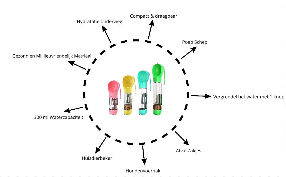 Deze slimme reisfles is gemaakt van duurzaam, voedselveilig kunststof en combineert drie handige functies in één compact ontwerp: een waterfles, een afneembare voer-/drinkbak en een geïntegreerde vuilniszakhouder. Met een inhoud van ca. 300–500 ml (afhankelijk van variant) is de fles groot genoeg voor wandelingen, dagtrips en korte reizen.